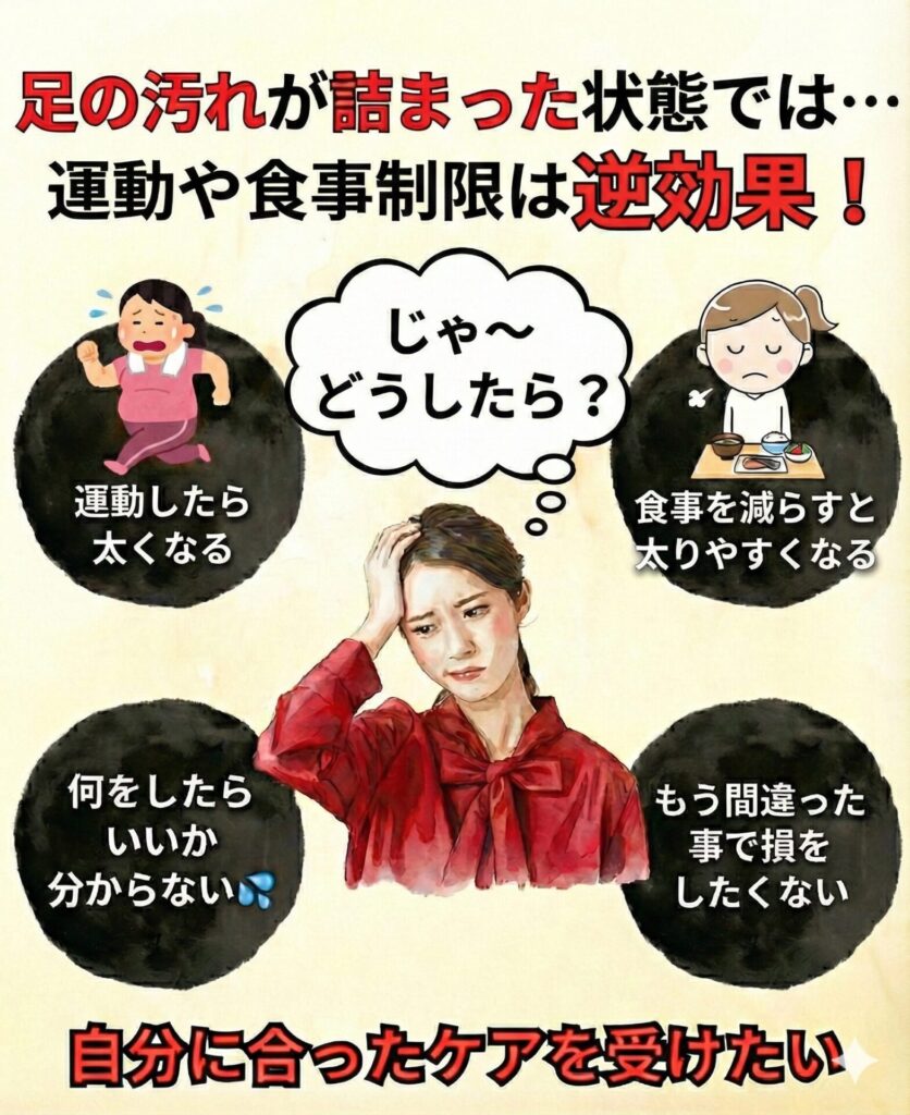 脚が太かった原因は、脂肪ではなく 長年の負担で固まり、流れを失った足だったのです。